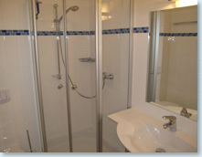 Der Sanitärbereich (Dusche, WC, Waschbecken) hat Fußbodenheizung. Die Böden sind in allen Zimmern vollständig gefliest.